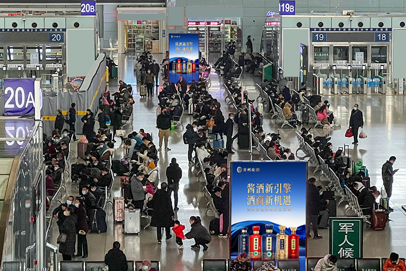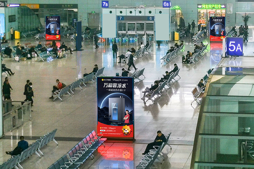 兆訊傳媒精研旅客行徑動(dòng)線,以最優(yōu)規(guī)劃布局石家莊站內(nèi)媒體,鎖定旅客停留時(shí)間最長的黃金候車場景,憑借超長時(shí)間媒體接觸提升品牌曝光機(jī)會。135英寸雙面LED刷屏以趨于旅客平視角度的最佳收看視角,將品牌畫面信息盡數(shù)呈現(xiàn),同時(shí)配合矩陣式平行排列布局,構(gòu)建“零距離”品牌沉浸空間。